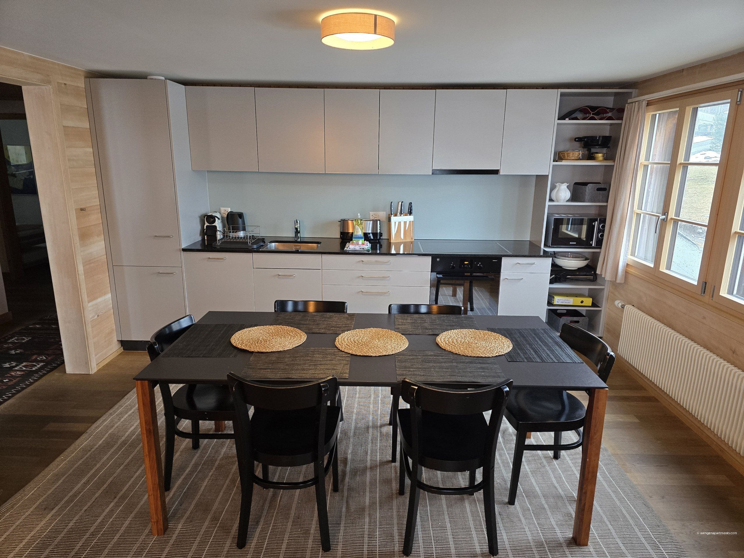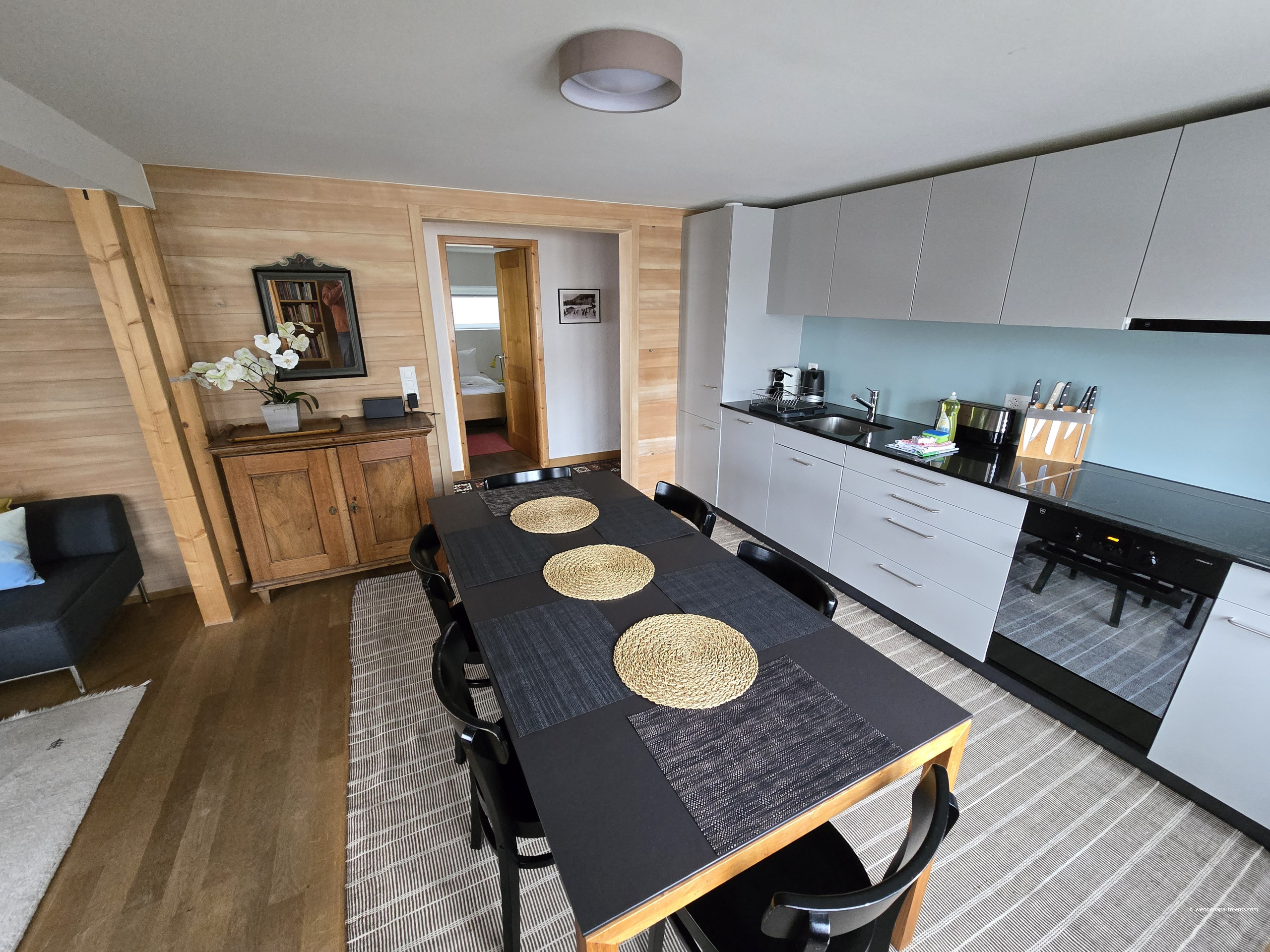 Im Herzen der Wohnung befindet sich ein heller, offener Wohnbereich, der Küche, Essbereich und Loungebereich kombiniert. Große Fenster in Süd- und Westausrichtung hereinbringen die Nachmittagssonne und rahmen die beeindruckende Berglandschaft. Die Küche ist vollständig ausgestattet für das Kochen zu Hause, komplett mit Fondue- und Raclette-Sets für gemütliche Abende. Der Essbereich ist großzügig und einladend, während die Lounge – mit bequemen Sitzgelegenheiten und einem Fernseher – perfekt zum Entspannen nach einem aktiven Tag im Freien ist.