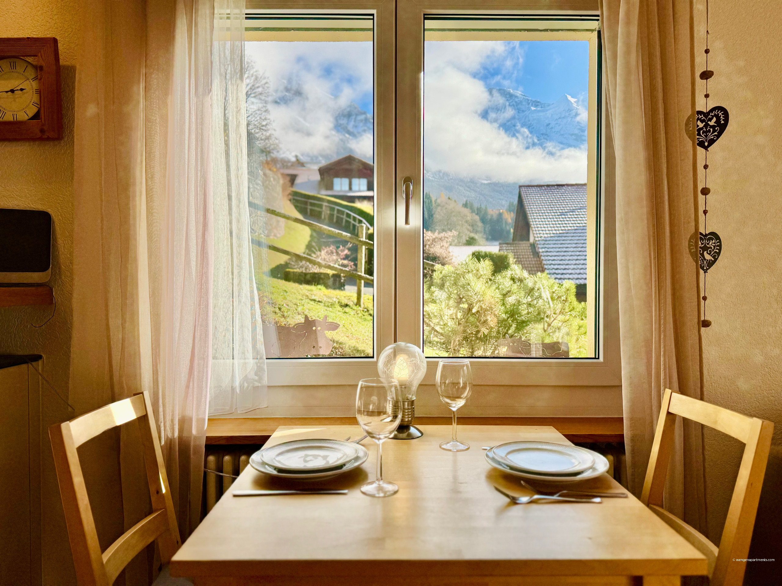 Gerbera 1 is a spacious and beautifully furnished ground-floor terrace apartment set in the peaceful lower area of Wengen, a charming car-free Alpine village with no road access. Designed for comfort and relaxation — perfect for couples seeking a romantic mountain escape. The apartment features a generous open-plan living area with a cosy fireplace and large windows that frame fabulous mountain views. The apartment is 64m2, 1 bedroom, 1 bathroom, with a separate WC. From the private terrace, you can unwind and take in the tranquil surroundings and stunning Alpine scenery. The modern kitchen comes fully equipped with a ceramic hob, oven, microwave, dishwasher, fridge-freezer, coffee machine, toaster, and all necessary utensils, making self-catering simple and enjoyable. Additional amenities include central heating, cable TV, radio, DVD player, a hair dryer, and an iron. Gerbera 1 is located approximately a 10-minute downhill walk from the village centre, train station, shops, and ski lifts—close enough for convenience yet far enough to enjoy the quiet beauty of the mountains. With its inviting ambience, romantic setting, and spectacular views, Gerbera 1 offers a delightful retreat for couples visiting Wengen.