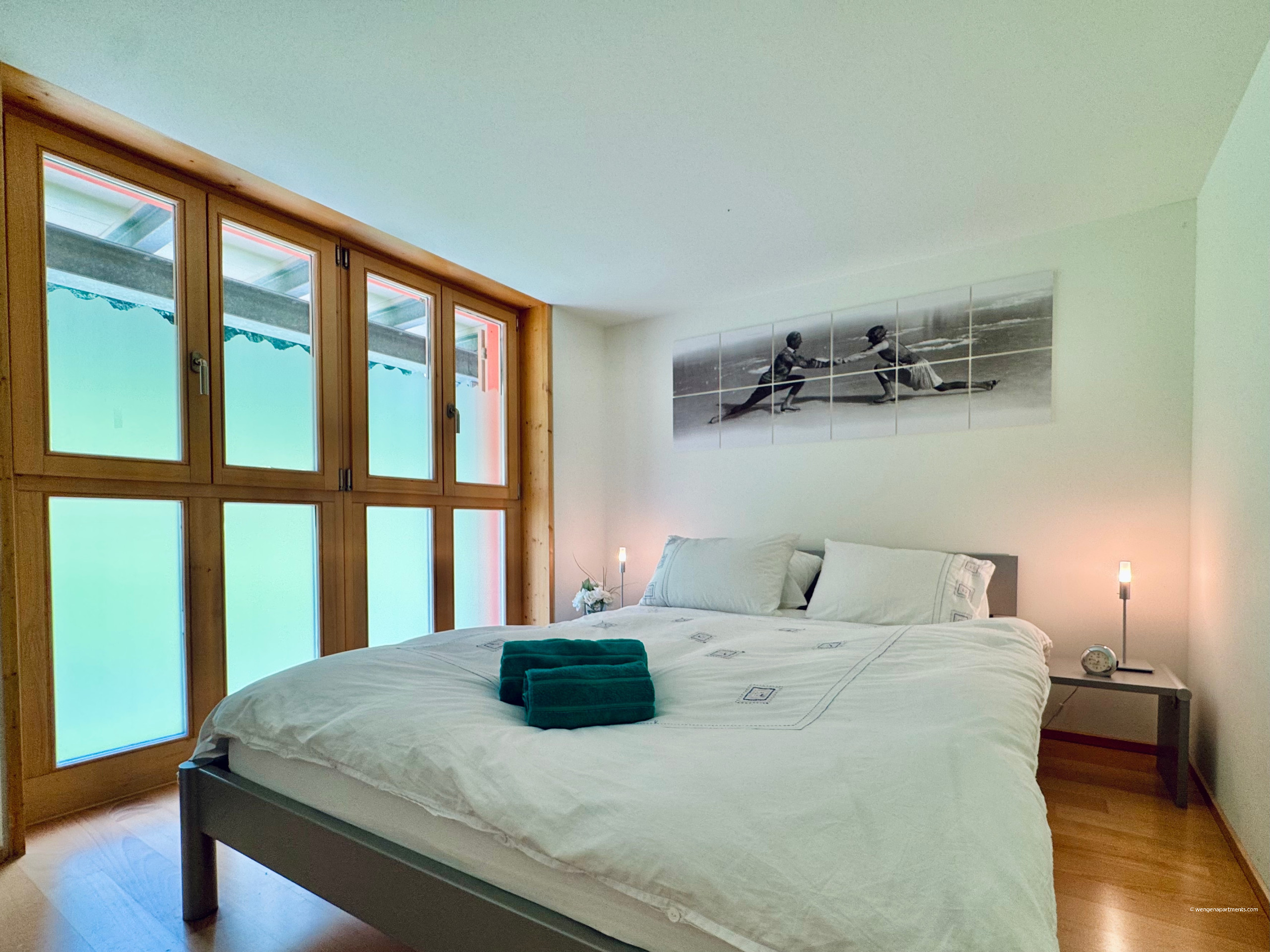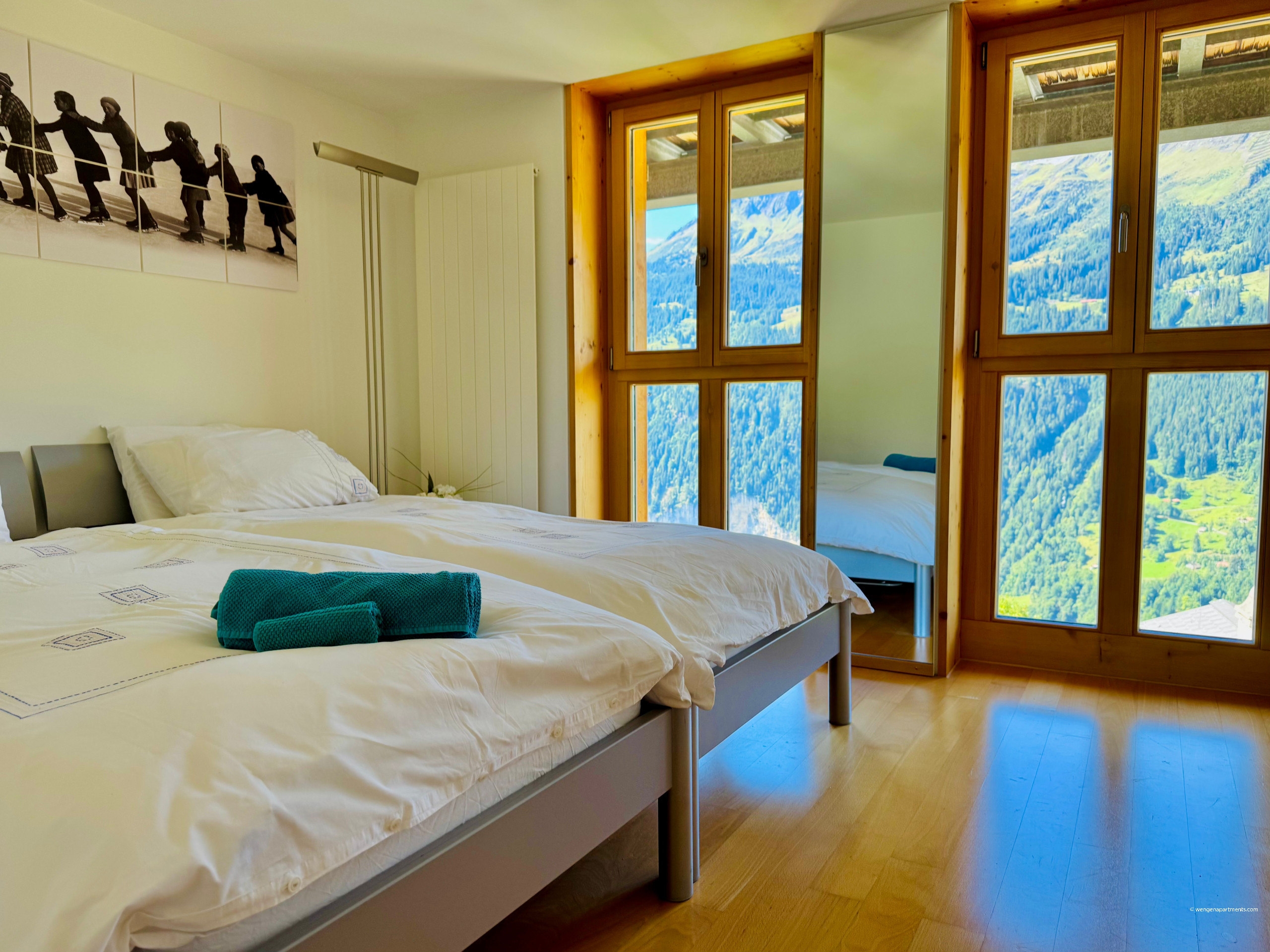 The Schweizerheim 1 is a spacious and tastefully furnished two-level apartment offering beautiful mountain and valley views in the peaceful, car-free village of Wengen. With 112 m² of bright living space, it comfortably sleeps up to six guests. The upper level features three welcoming bedrooms—one with a king bed, one with a queen bed, and one with two single beds—alongside a bathroom with a bathtub and shower combination, plus a separate WC for added convenience. The sleeping area is quiet and comfortable, making it an ideal retreat after a day in the Alps.