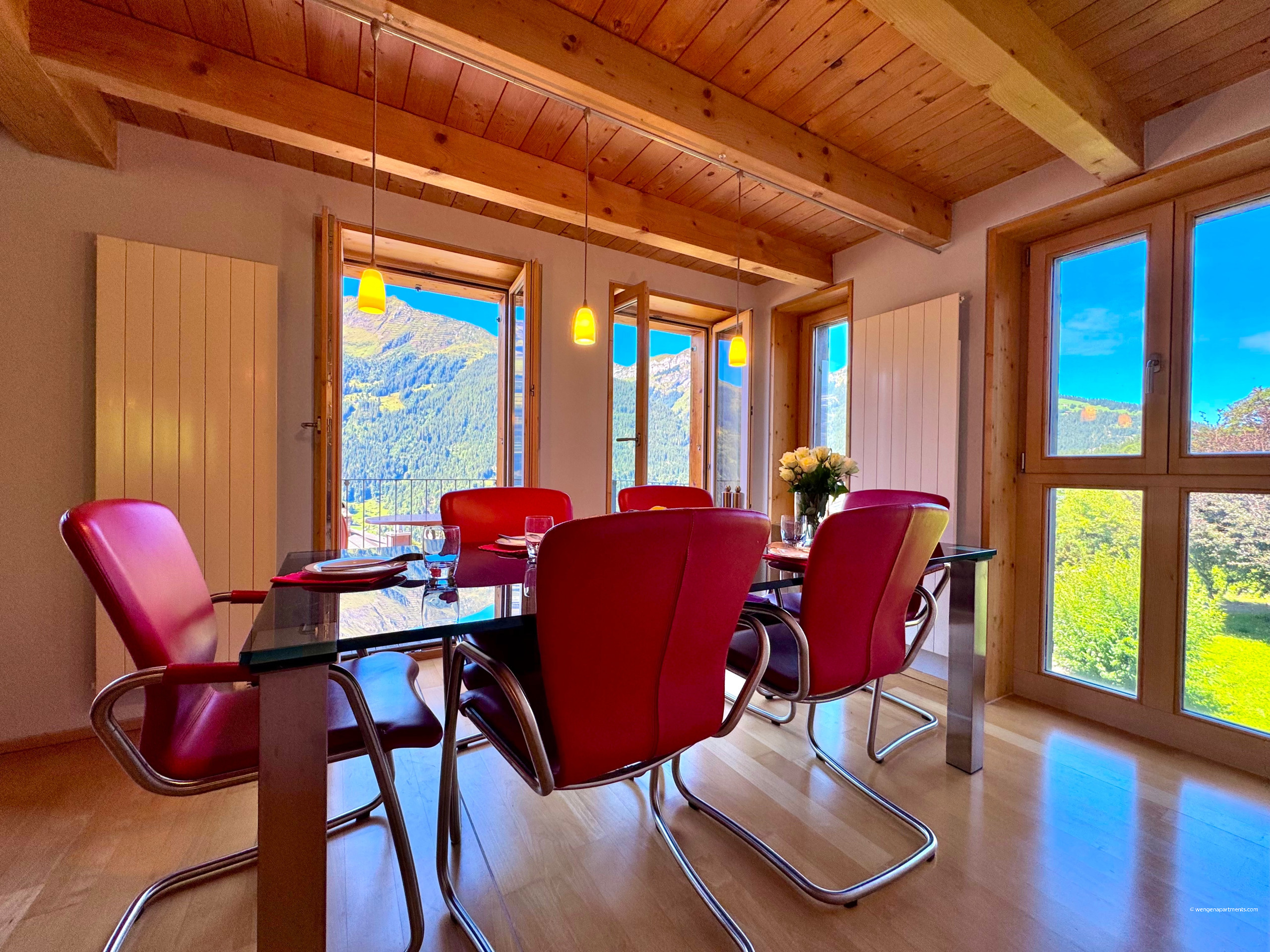 On the lower level, the apartment opens into a warm and inviting living and dining space with large windows that fill the room with natural light. From here, guests can step out onto the balcony, furnished for relaxing while taking in the surrounding mountain scenery. The open-plan kitchen is fully equipped with a glass-ceramic stove, refrigerator, freezer, oven, microwave, dishwasher, coffee machine, and all essential cookware—perfect for preparing meals at home. Additional amenities include a washing machine, dryer, central heating, Internet TV, and a hairdryer.