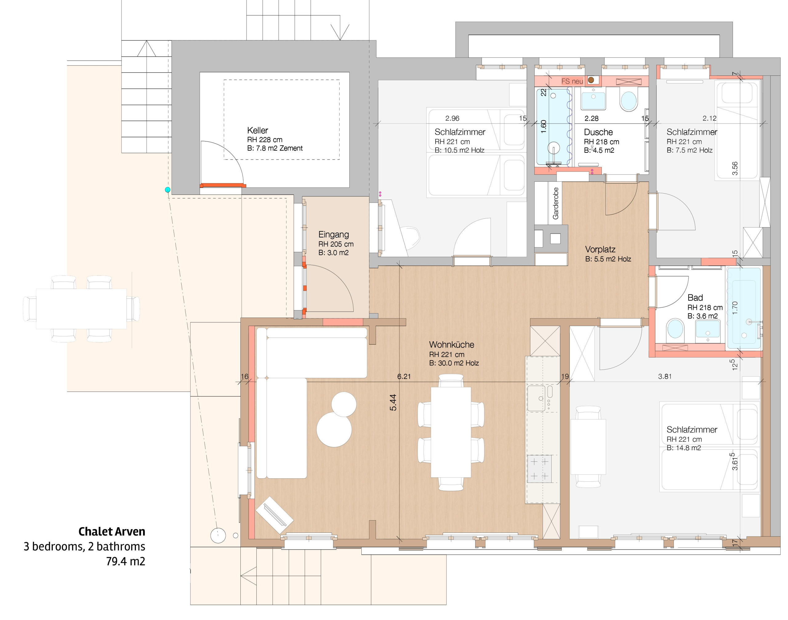 Step outside to the spacious terrace, where you can soak up the sun and take in the uninterrupted mountain views. A small garden area just below adds extra outdoor space, and with deck chairs, a charcoal BBQ, outdoor dining furniture, and a sun umbrella, there's everything you need to enjoy the fresh alpine air.