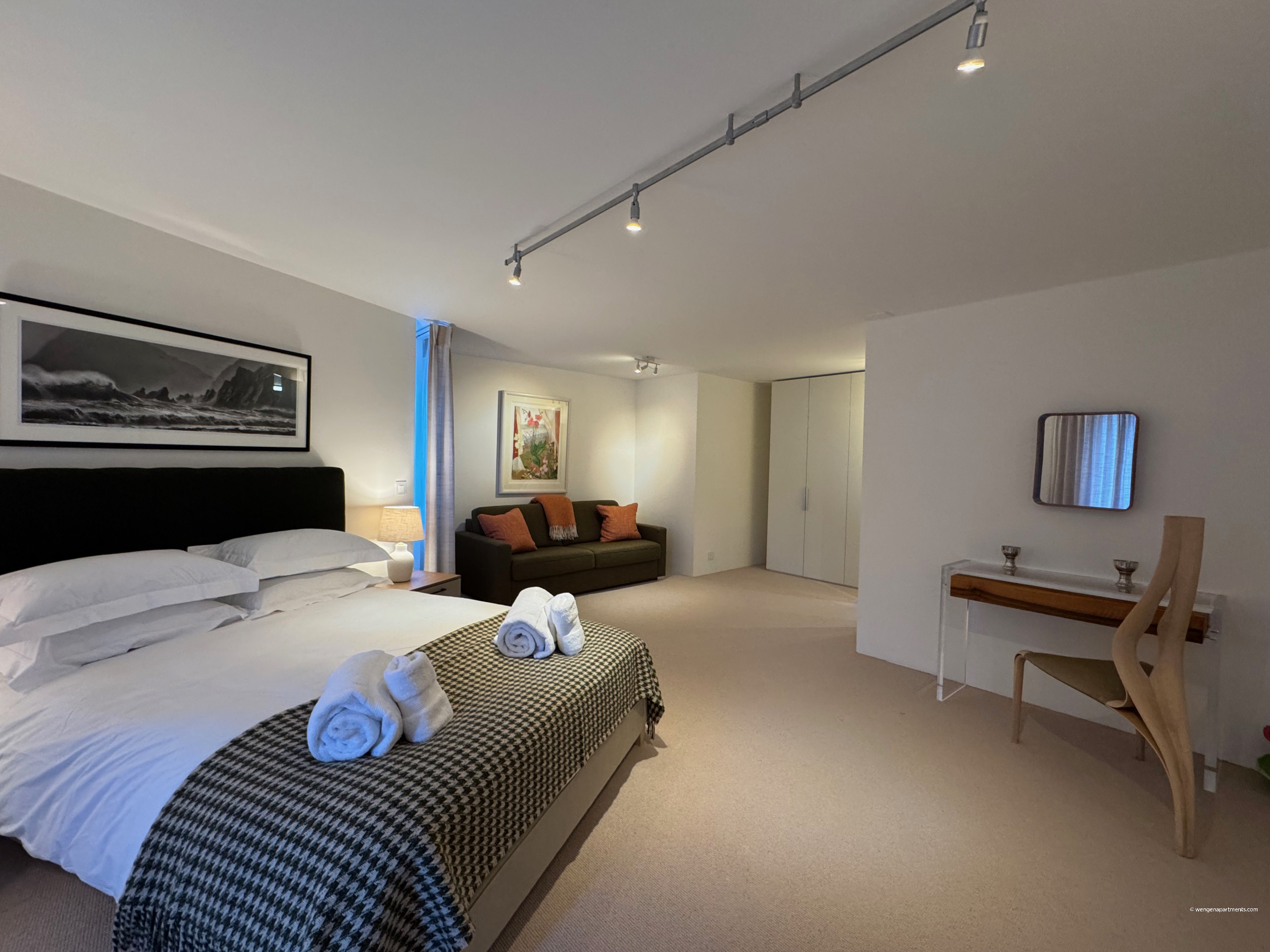Eiger Residences 2 is a very central, high-end holiday apartment located at the foot of the ski slopes in the family-friendly car-free village of Wengen. It is tastefully furnished, very light, and offers wonderful views of the mountains and slopes. The location is exceptional, situated just 15 meters from the village centre, 35 meters from the supermarket and Wengen train station, and only 135 meters from the ski lifts.