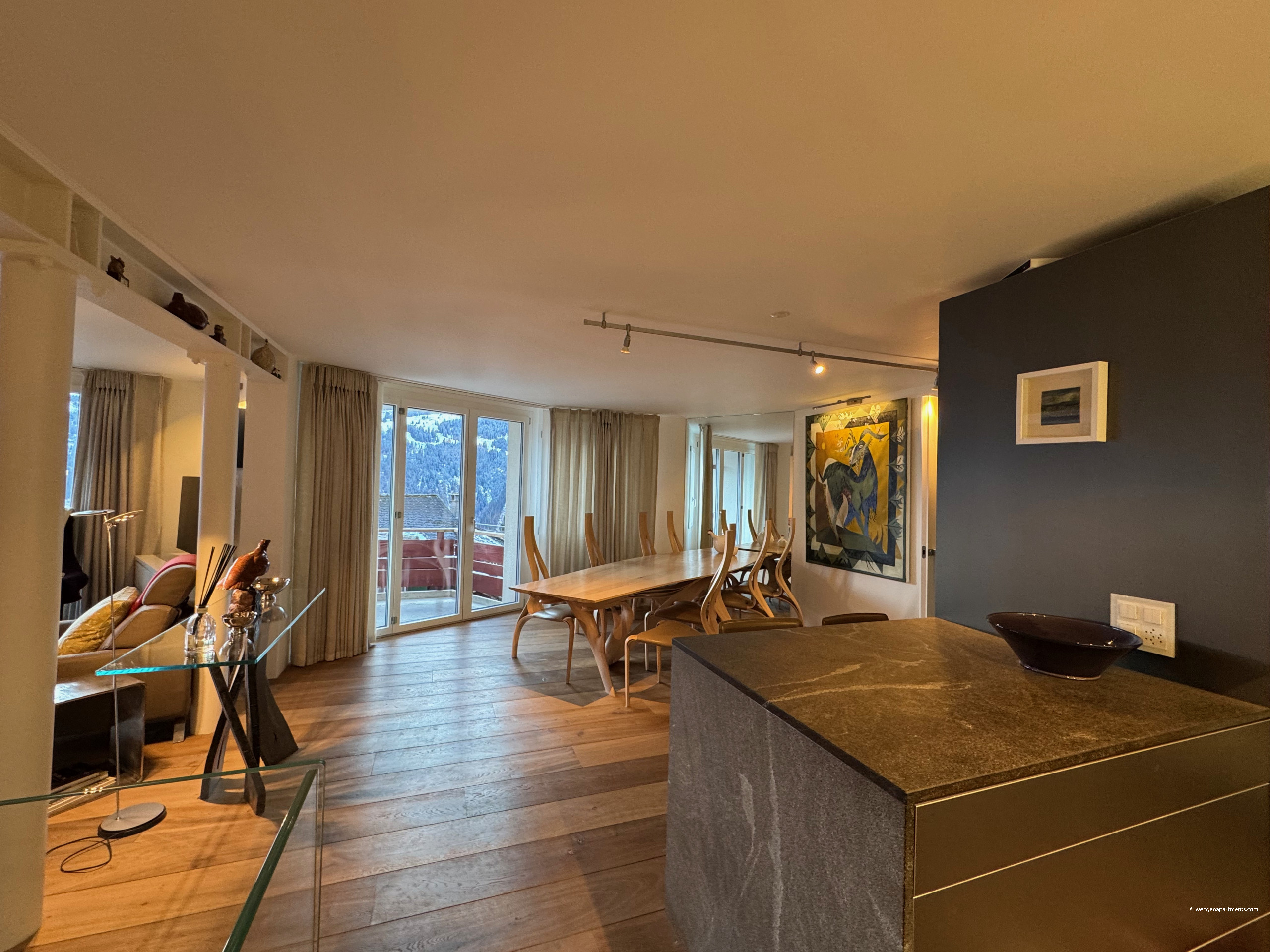 This spacious 180 m² accommodation is perfectly positioned for winter sports enthusiasts, being only 135 meters from the ski lifts. It is also incredibly convenient for arrival, located just 35 meters from the Wengen train station. Taxis are available for hire at Wengen train station if you require assistance to the residence.